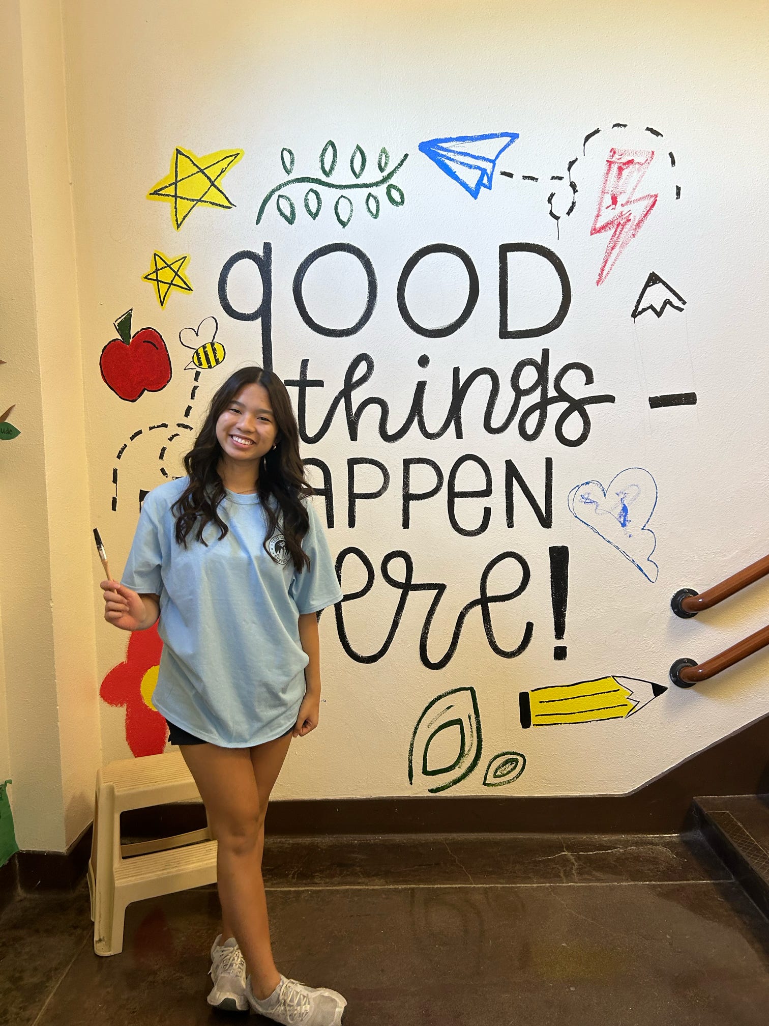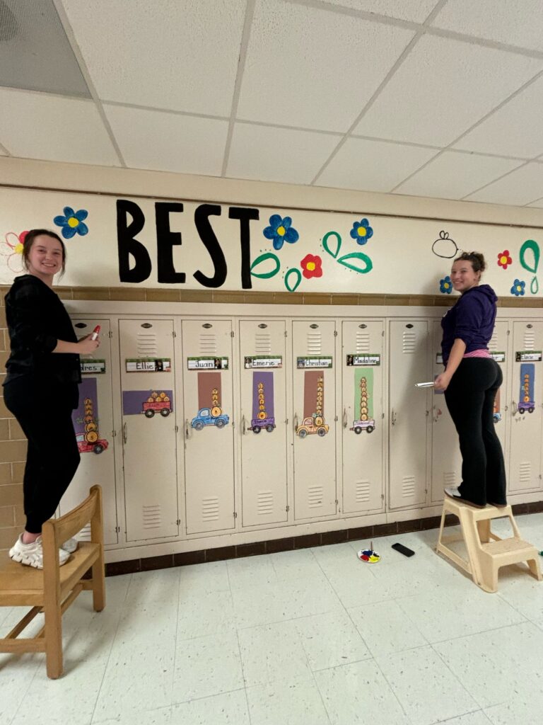 Although the Day of Service lasts only a few hours each semester, Partika noted that many walls remained unpainted once it ended. That’s when LEAPS—Leaders Engaging & Assisting People through Service, a first‑year leadership program advised by Partika—stepped in with the initiative dubbed “Mural Mania.” Over 60 students volunteered to create murals with inspirational messages for Meadowbrook students.